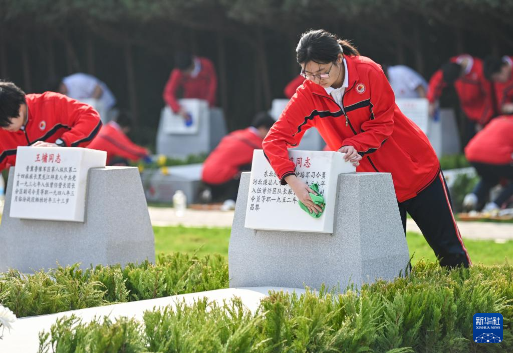 4月2日,在位于河北省石家庄市的华北军区烈士陵园,学生为烈士擦拭墓碑。新华社发(张晓峰摄)