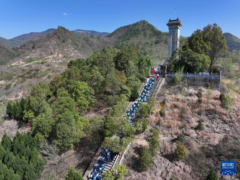 4月1日,在湖北省襄阳市保康县歇马镇烈士陵园,保康县歇马镇小学学生参加清明祭英烈主题教育活动(无人机照片)。新华社发(杨韬摄)