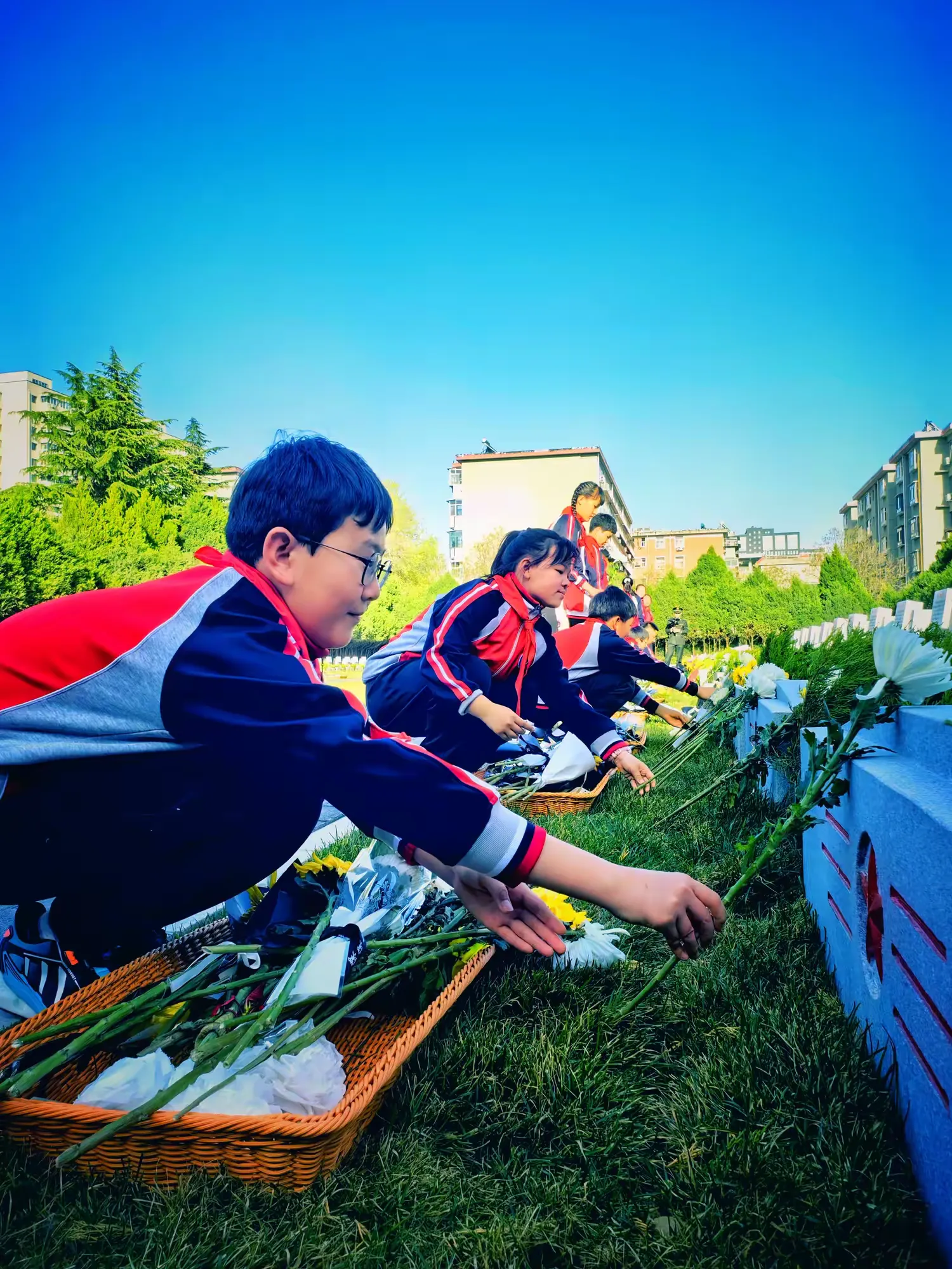 在烈士墓碑前,孩子们手持白菊,依次轻轻献花、深深鞠躬。有的孩子蹲下身子拂去墓碑上的尘土,有的默默记下烈士的名字。一束白菊、一个队礼、一份敬意,红色种子在无声中生根发芽。